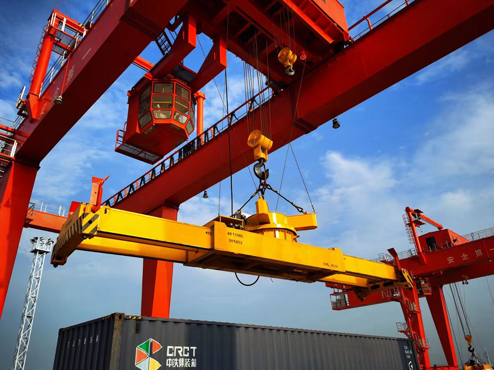 門式起重機(jī)是橋式起重機(jī)的一種變形,又叫龍門吊。主要用于室外的貨場(chǎng)、料場(chǎng)貨、散貨的裝卸作業(yè)。門式起重機(jī)具有場(chǎng)地利用率高、作業(yè)范圍大、適應(yīng)面廣、通用性強(qiáng)等特點(diǎn),在港口貨場(chǎng)得到廣泛使用?! ∷慕饘俳Y(jié)構(gòu)像門形框架,承載主梁下安裝兩條支腳,可以直接在地面的軌道上行走,主梁兩端可以具有外伸懸臂梁?! ¢T式起重機(jī)(又稱龍門起重機(jī))是橋架通過(guò)兩側(cè)支腿支撐在地面軌道上的橋架型起重機(jī)。在結(jié)構(gòu)上由門架、大車運(yùn)行機(jī)構(gòu)、起重小車和電氣部分等組成。有的門式起重機(jī)只在一側(cè)有支腿,另一側(cè)支撐在廠房或棧橋上運(yùn)行,稱作半門式起重機(jī)。門式起重機(jī)的門架上部橋架(含主梁和端梁)、支腿、下橫梁等部分構(gòu)成。為了擴(kuò)大起重機(jī)作業(yè)范圍,主梁可以向一側(cè)或兩側(cè)伸出支腿以外,形成懸臂。也可采用帶臂架的起重小車,通過(guò)臂架的俯仰和旋轉(zhuǎn)擴(kuò)大起重機(jī)作業(yè)范圍。
